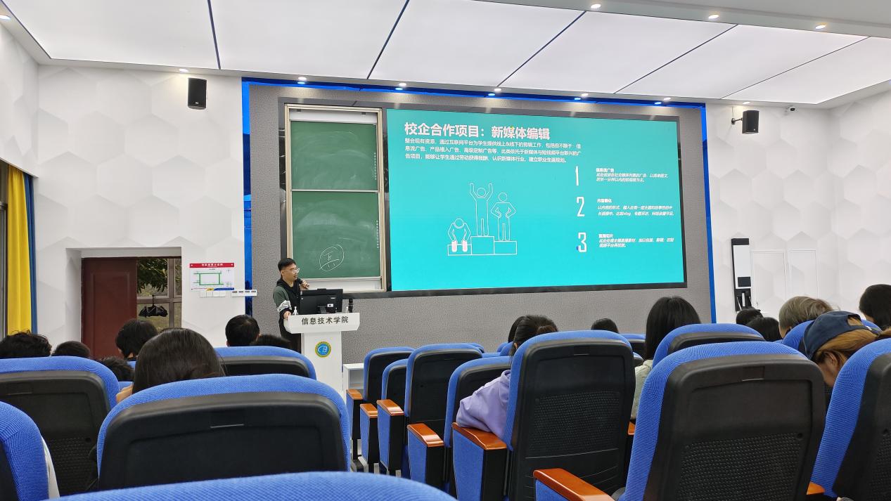 此次宣讲会从公司信息、项目介绍-新媒体编辑和创新创业扶持计划三个方面展开。