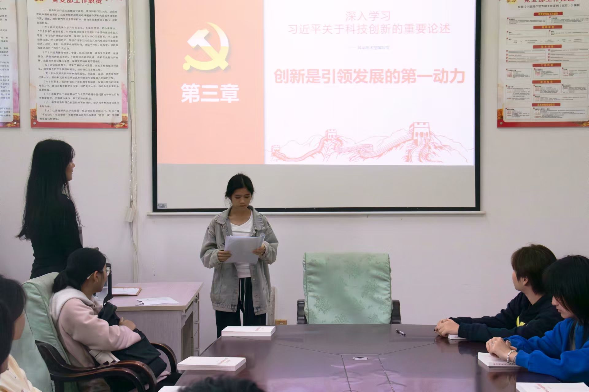 活动伊始,王紫芯组织同学们自行阅读关于科技创新的相关重要论述,同学们认真阅读并深入领会科技创新在新时代背景下的重要意义。随后,王紫芯进行了发言,她着重强调了创新发展在新时代的重要性,指出其是解决发展动力问题的关键所在。