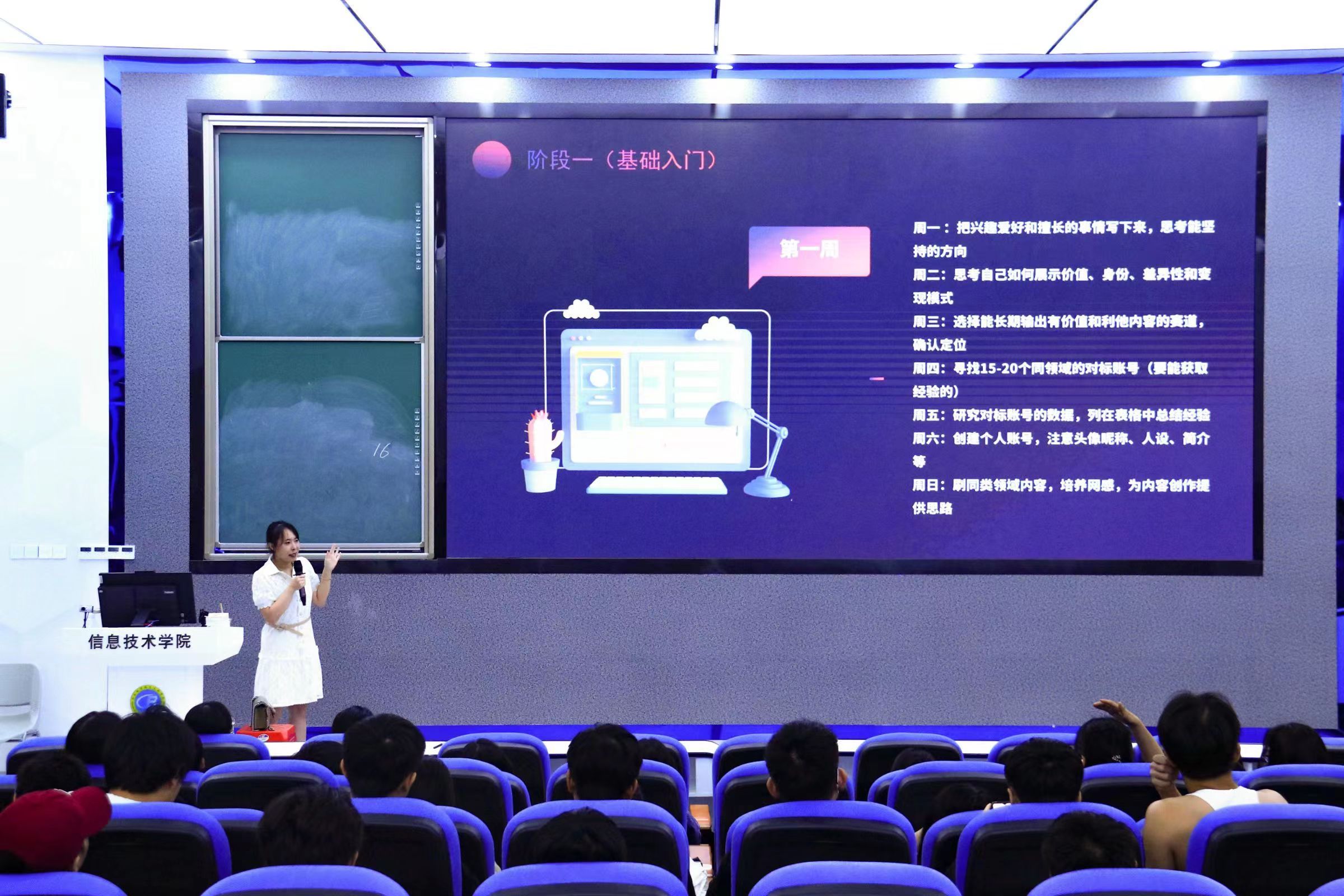 讲座伊始,王倩老师通过提问的方式列出同学们就自媒体普遍关注的话题,如用什么软件剪辑、哪里找视频和图片素材、如何找热点和文案以及如何配音等,之后引出本次讲座的主题“自媒体入门——必备软件合集”。王老师分别从视频剪辑类、修图软件类、设计排版类、写作文案类、数据分配和运营学习类、办公和图片素材类、热点资讯类自媒体依次推荐相对应的软件app。讲座中,王老师通过剪影、一言等app进行现场演示讲解,使同学们清晰地了解到自己的需求和适用的软件。最后,王老师以“自媒体博主计划”为题,讲述基础入门四个阶段,让同学们了解成为一名自媒体博主,是日益积累、循序渐进的过程。讲座最后,王老师就搭建个人账号、发布时间、主题脚本、视频拍摄技巧、新手剪辑技巧等问题与现场同学进行互动交流,讨论,同学们纷纷表示受益匪浅。