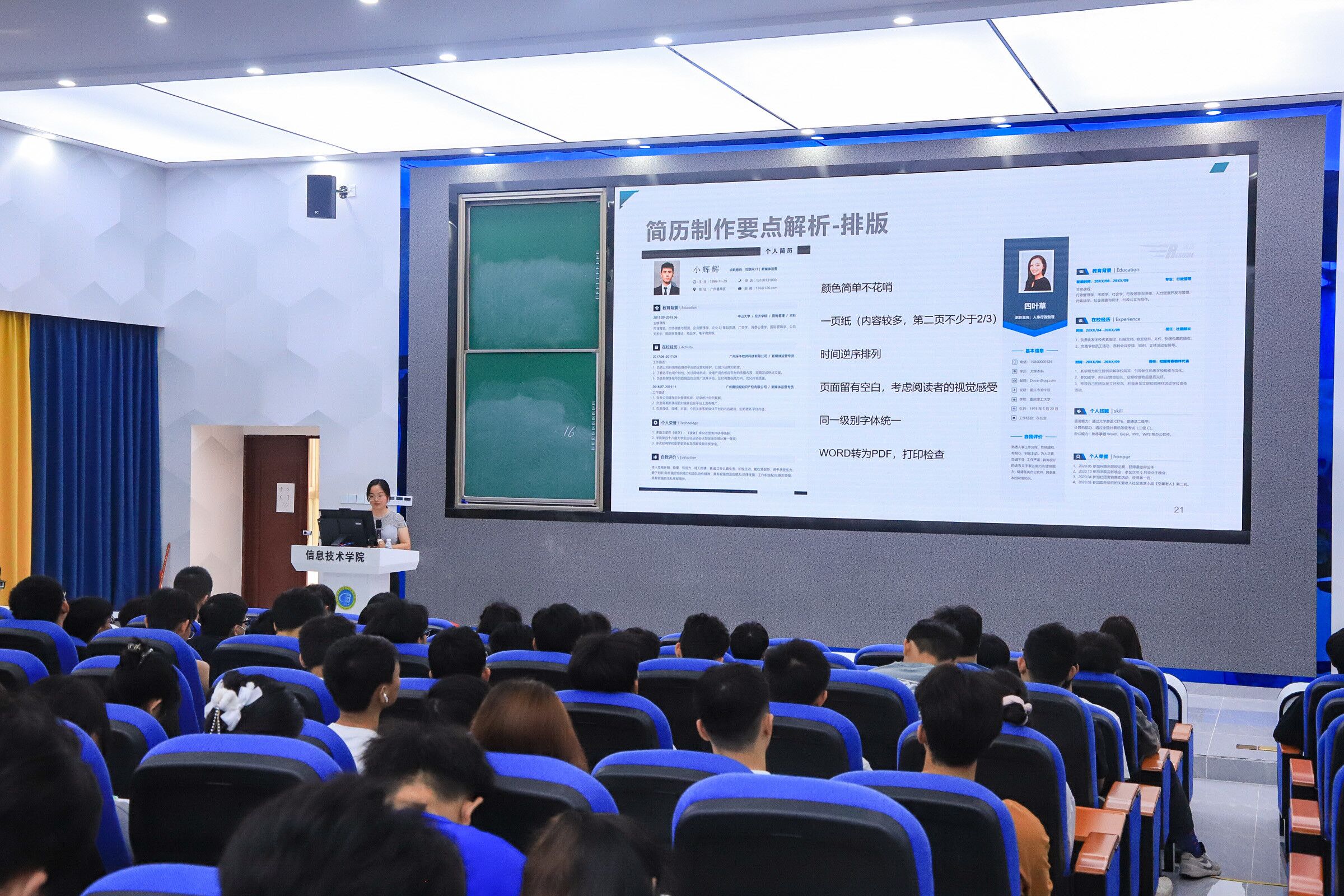 本次讲座围绕“准备一份必胜的简历”展开,讲座中,孙岩老师首先提到简历是求职经历中的第一步,分别对简历制作的内容排版要点解析、优秀简历欣赏、简历检查与完善三点进行精细讲解。讲座最后,孙岩老师展示真实简历作为案例,与同学们一起互动探讨简历中存在的问题,使同学们清晰地了解到简历制作中的困惑以及充分意识到写好简历的重要性。