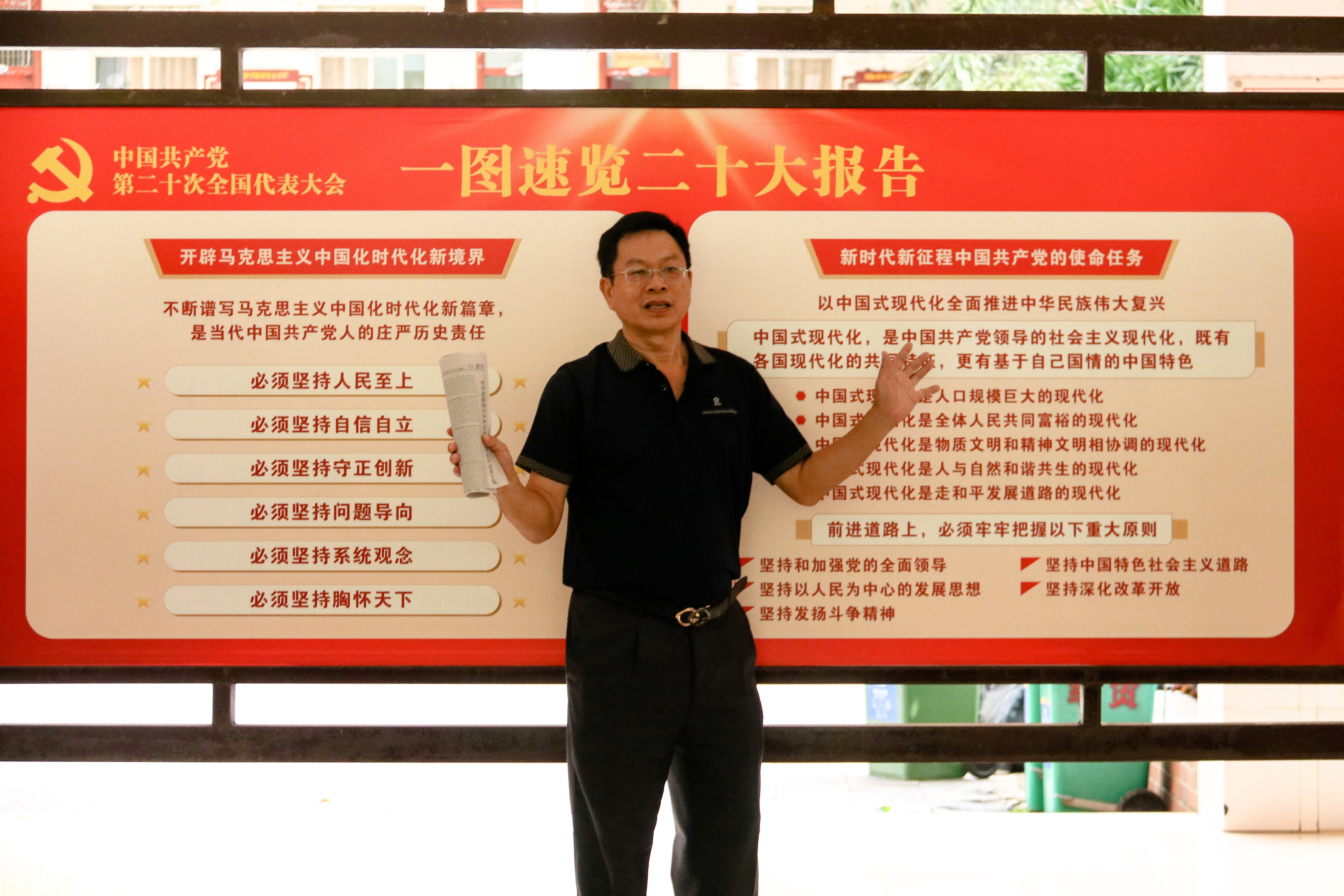 2022年11月30日,为深入贯彻学习党的二十大精神,进一步了解党的发展历史,11月30日上午,五老陈继敏同志在第一教学楼架空层开展党的二十大精神现场教学,公司员工党支部书记代晓明老师与22级员工代表参与此次学习。