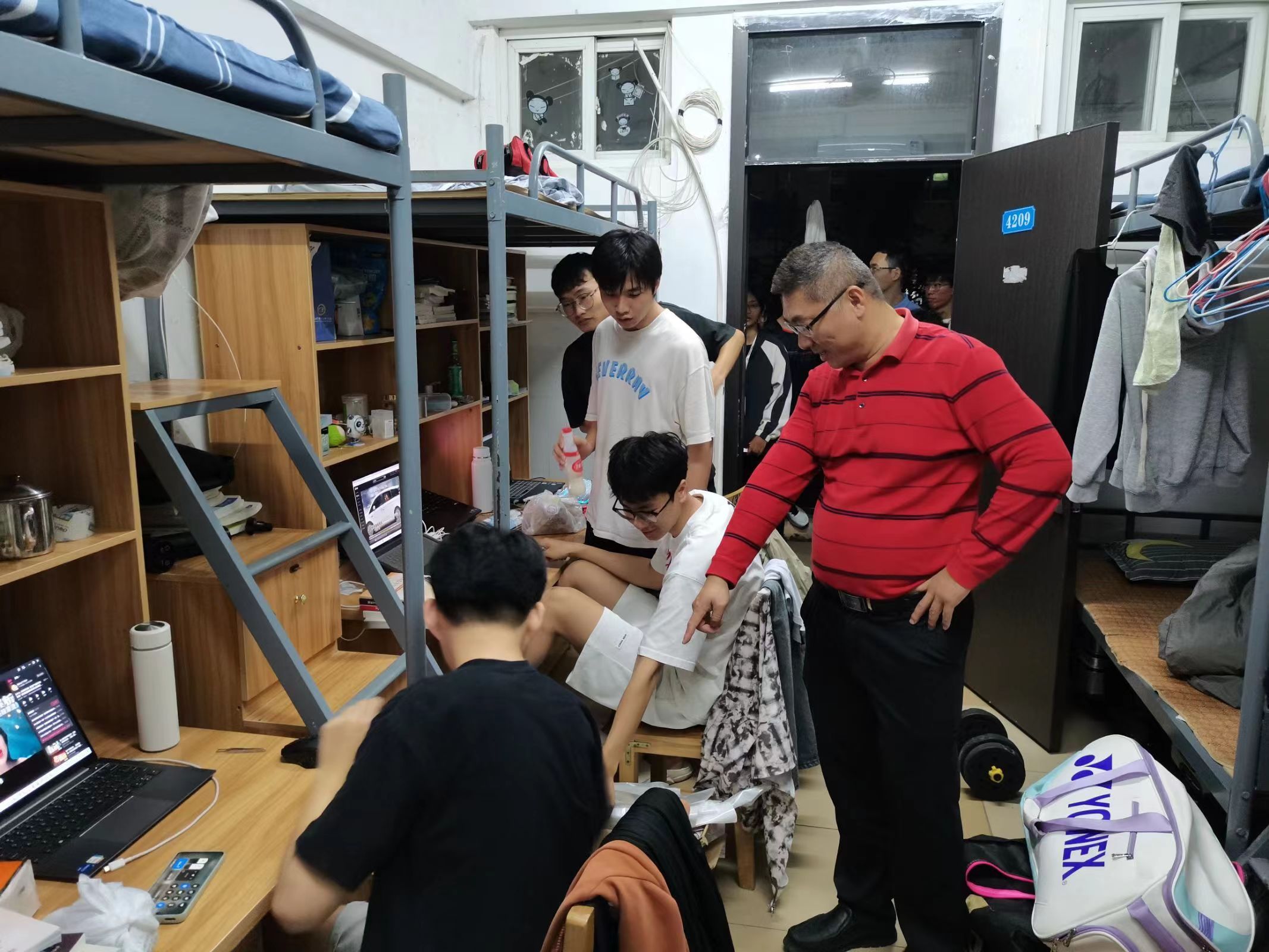 3月4日晚,beat365英国官网网站党总支副书记黄守官、学工办负责人唐图及全体辅导员和团学干部们到员工宿舍