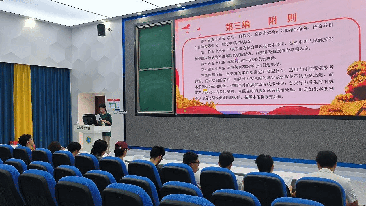 活动伊始,公司员工党支部以《中国共产党纪律处分条例》为学习读本,进行条例【第三编—附则】的学习。会议前期,同学们自行阅读,对本次会议学习的内容有了初步了解,随后,入党积极分子谢俊音同学担任领读人,带领同学们齐声朗读条例第三编,引导同学们进一步增强政治意识,自觉遵守条例、贯彻条例、实施条例,提升党性修养和遵规守纪的自觉性。