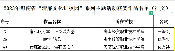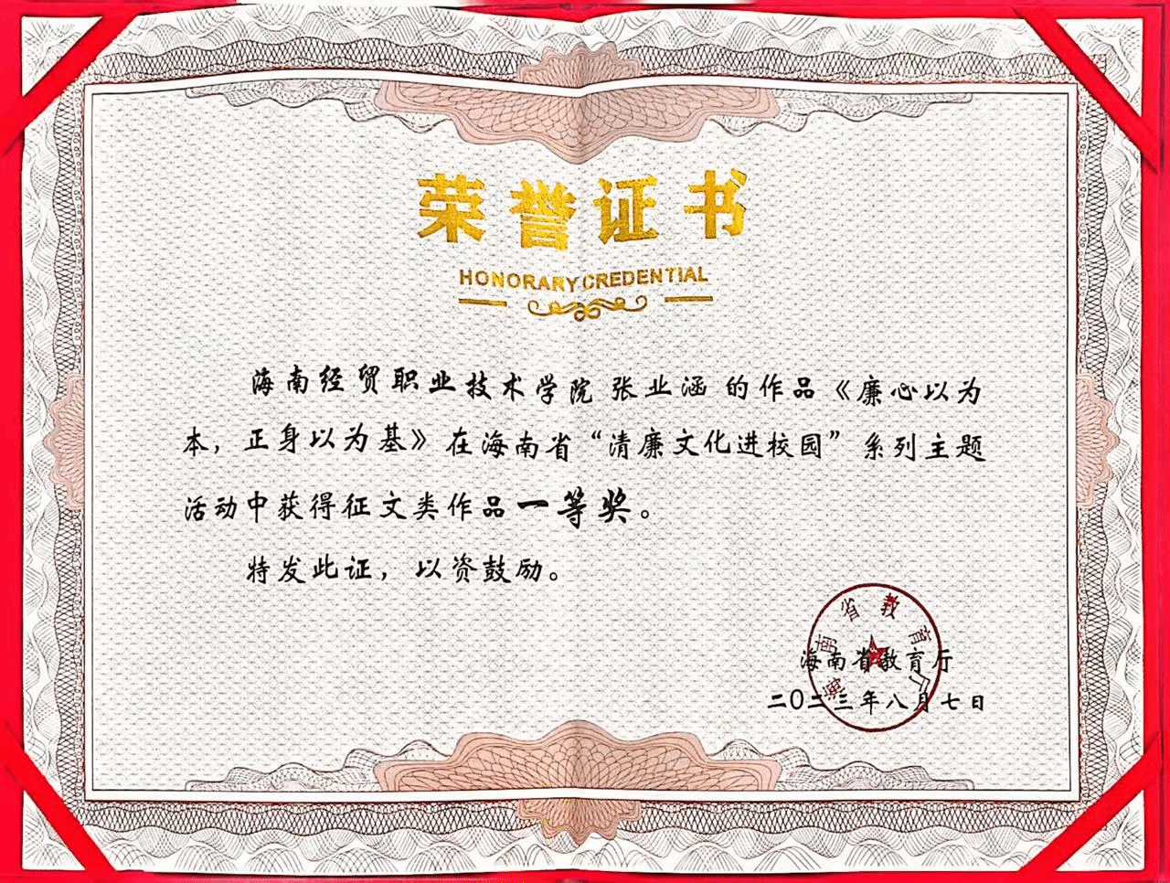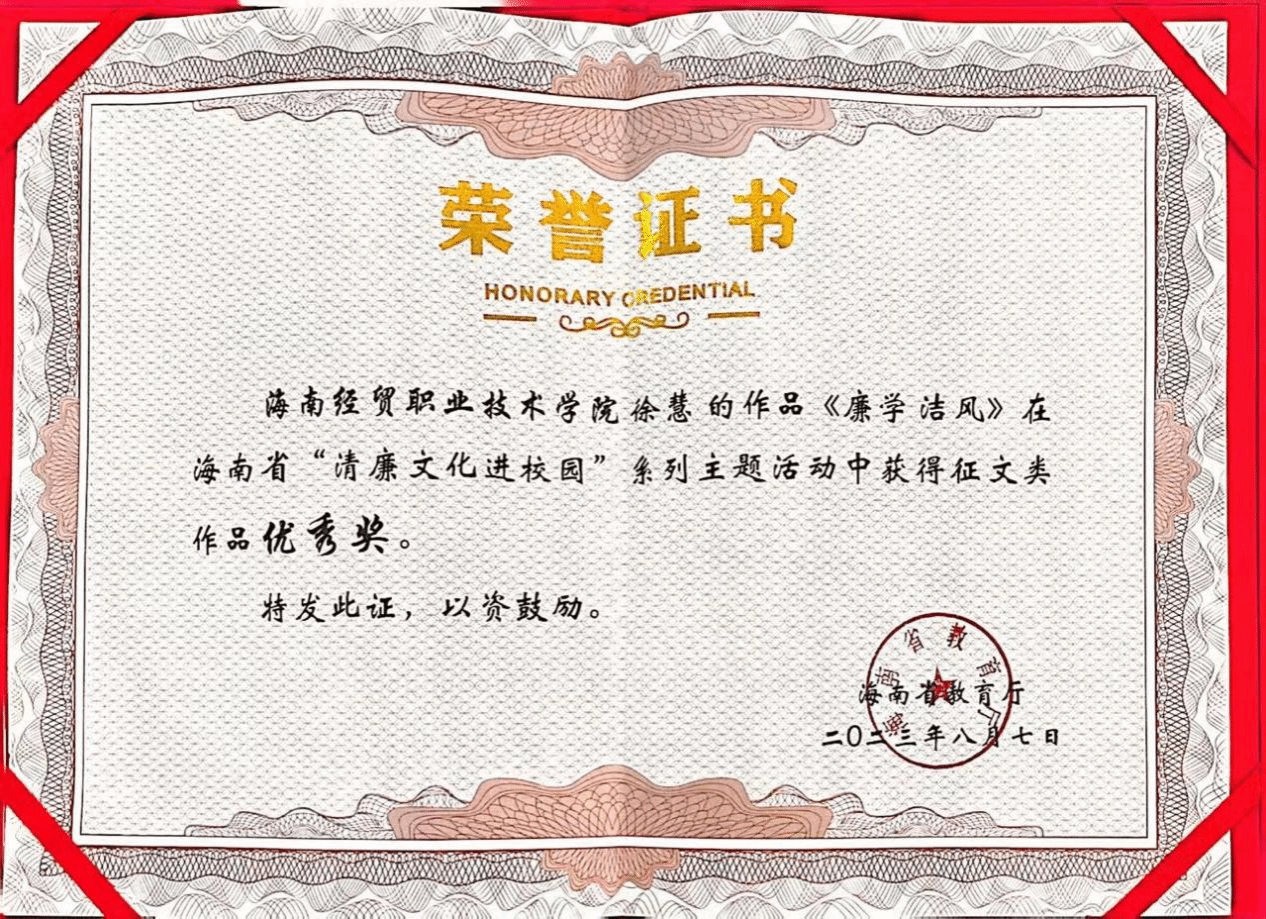 公司精心组织,广泛动员师生积极参与海南省教育厅2023年“清廉文化进校园”系列主题活动,创作了一批优秀的清廉文化作品。在公司师生的共同努力下,beat365英国官网网站张业涵同学荣获一等奖,徐慧、潘颖同学荣获优秀奖。这些作品展示了员工对清廉文化的深刻理解和独到见解,体现了公司在清廉文化建设方面的成果。期待未来在清廉文化教育和传承方面取得更多成绩,为营造风清气正的校园环境贡献力量。