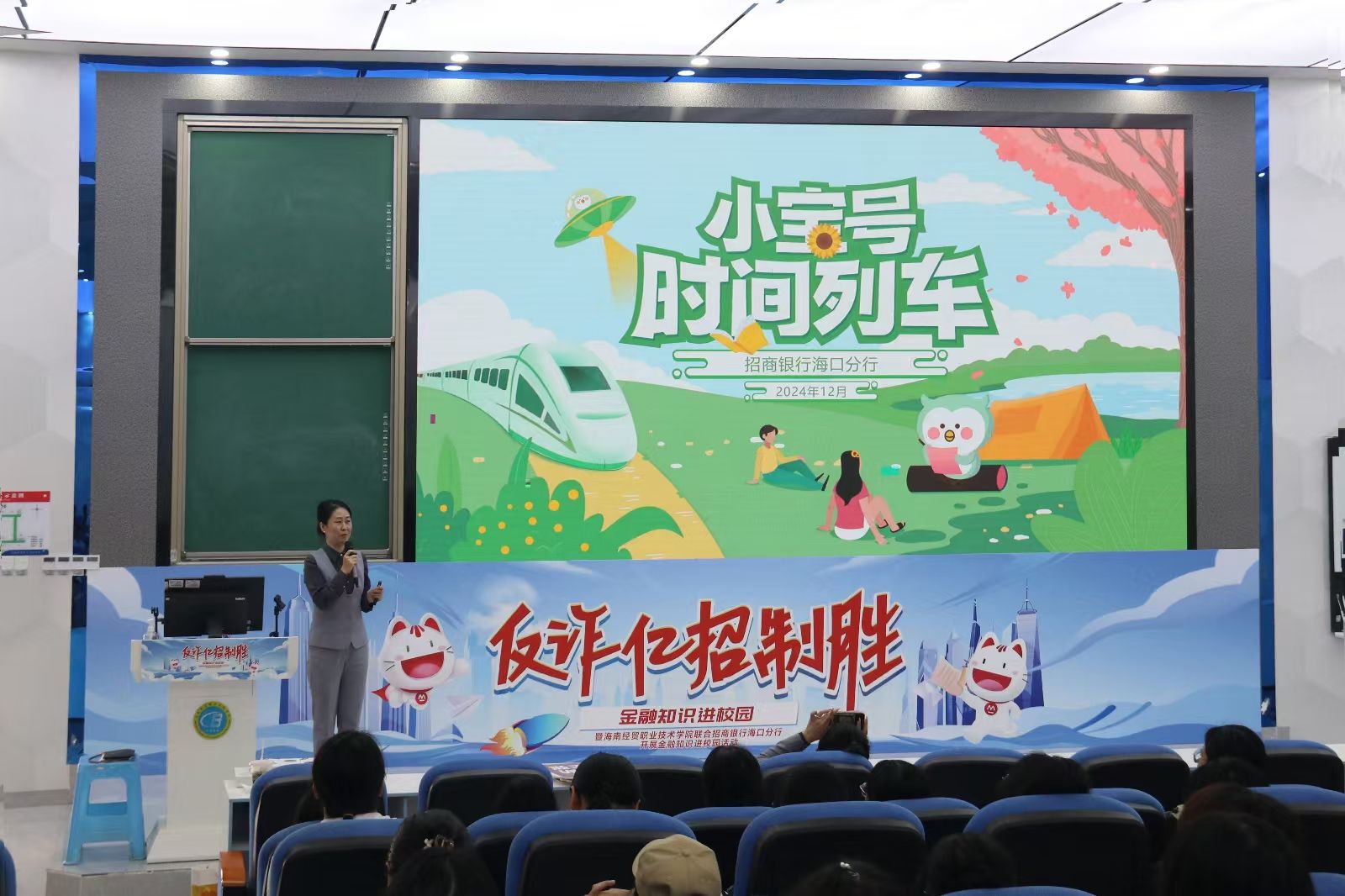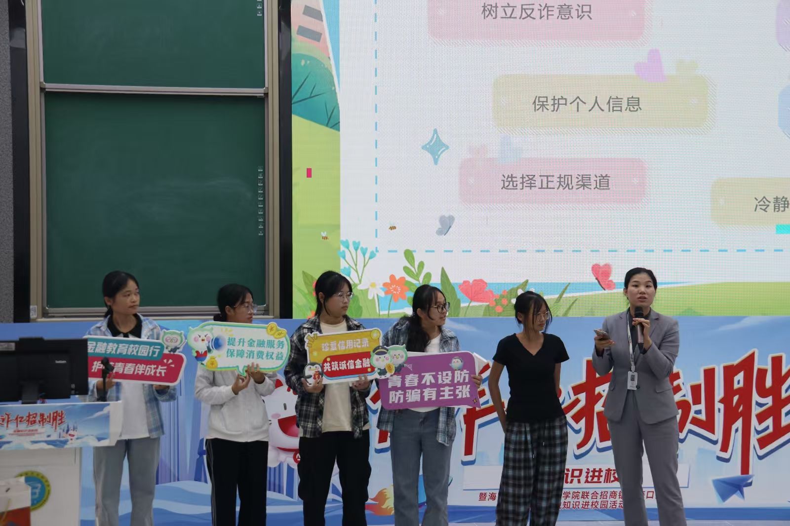 活动伊始,招商银行海口分行的工作人员结合同学们的校园生活实际,从多个维度深入剖析了常见的诈骗案例,通过细致入微的分析,使同学们深刻认识到诈骗行为的危害性和隐蔽性。工作人员详细讲解了“杀猪盘”“断卡行动”“征信修复”等金融诈骗的相关知识,并着重指出了高利贷、银行卡非法交易等危险行为,引导同学们提高警惕,增强自我保护意识。在知识讲解环节之后,同学们有序前往楼下参与了一系列精心设计的游戏类活动,这些活动寓教于乐,不仅让同学们在轻松愉快的氛围中学习到了更多的金融知识,还进一步提升了他们的反诈实战能力。