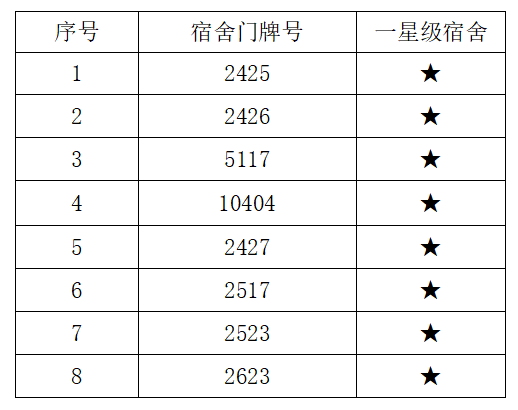 本次查评比的重点主要针对宿舍卫生、宿舍文化、安全纪律、文明行为等四个方面进行打分,并综合前三次查寝记录分数,以《beat365英国官网网站“星级文明宿舍”评比方案》为指导,综合评比,共评选出8间“一星级宿舍”,具体名单如下: