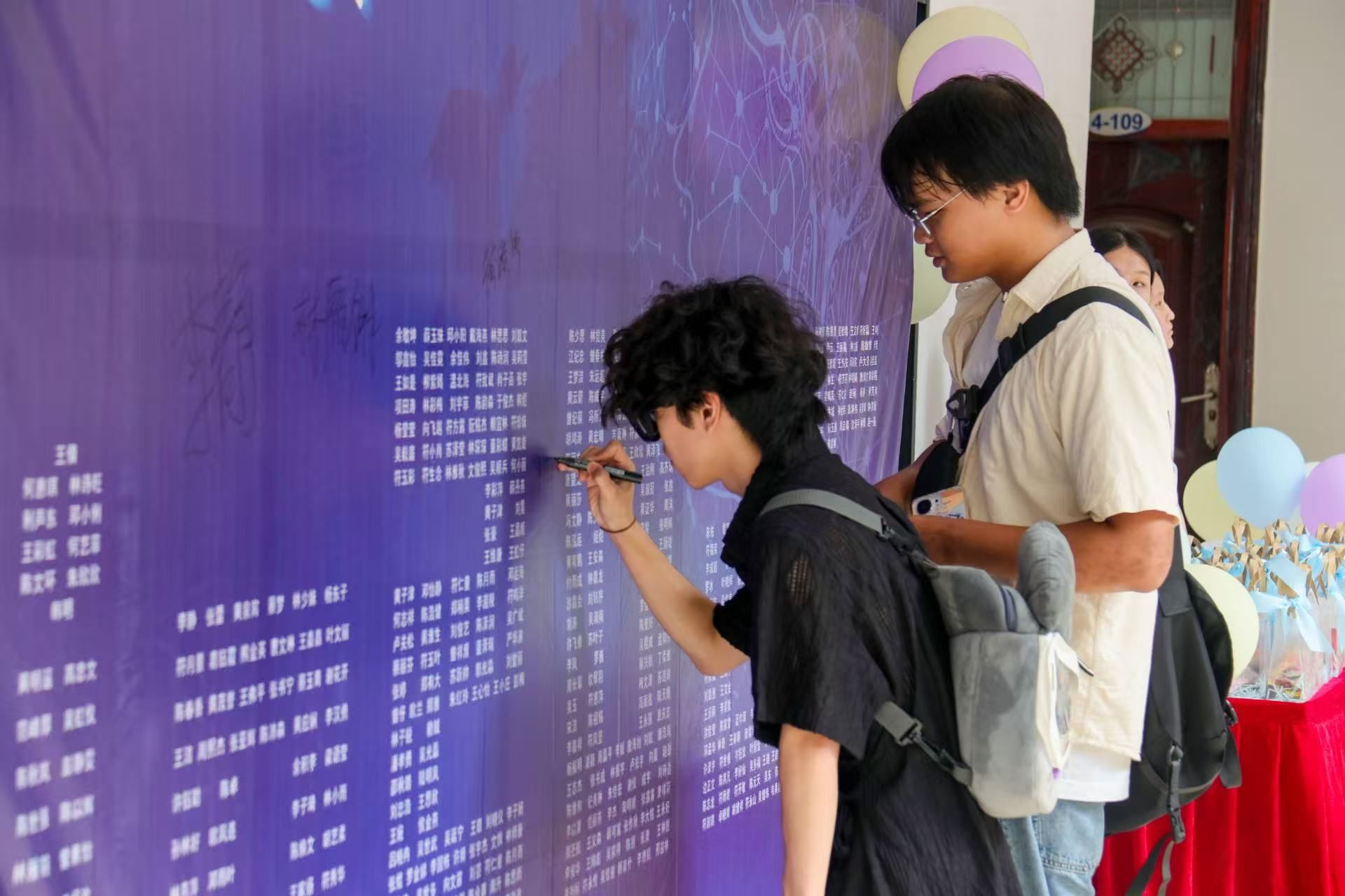 微风吹拂着,楼上的风车慢悠悠的旋转着,在领取完档案后,毕业生们带着激动与欢笑来到了毕业活动会场,在签名墙上留下了青春的痕迹!又或是留下生动有趣的寄语,传递着蓬勃朝气去给予学弟学妹们。