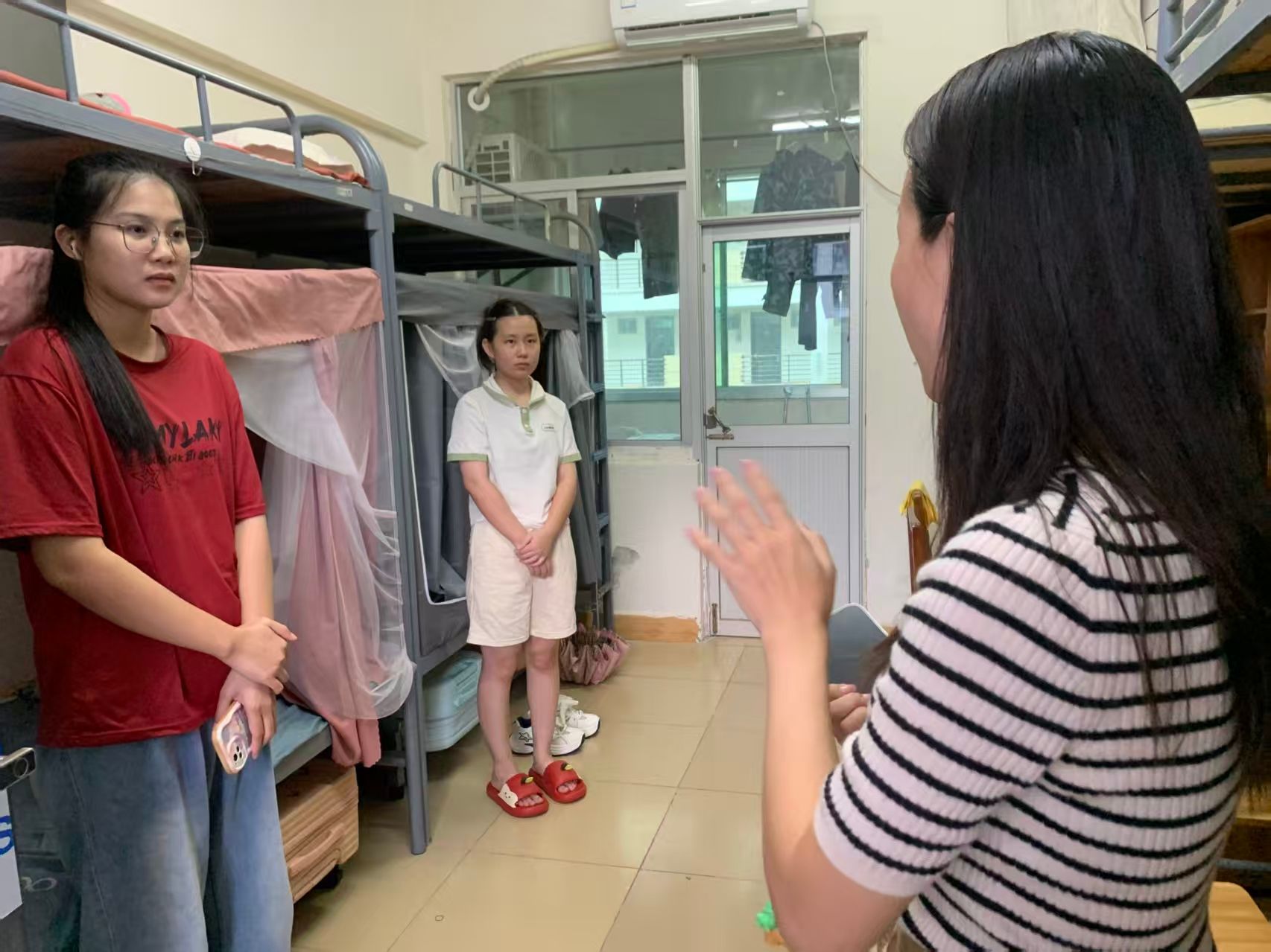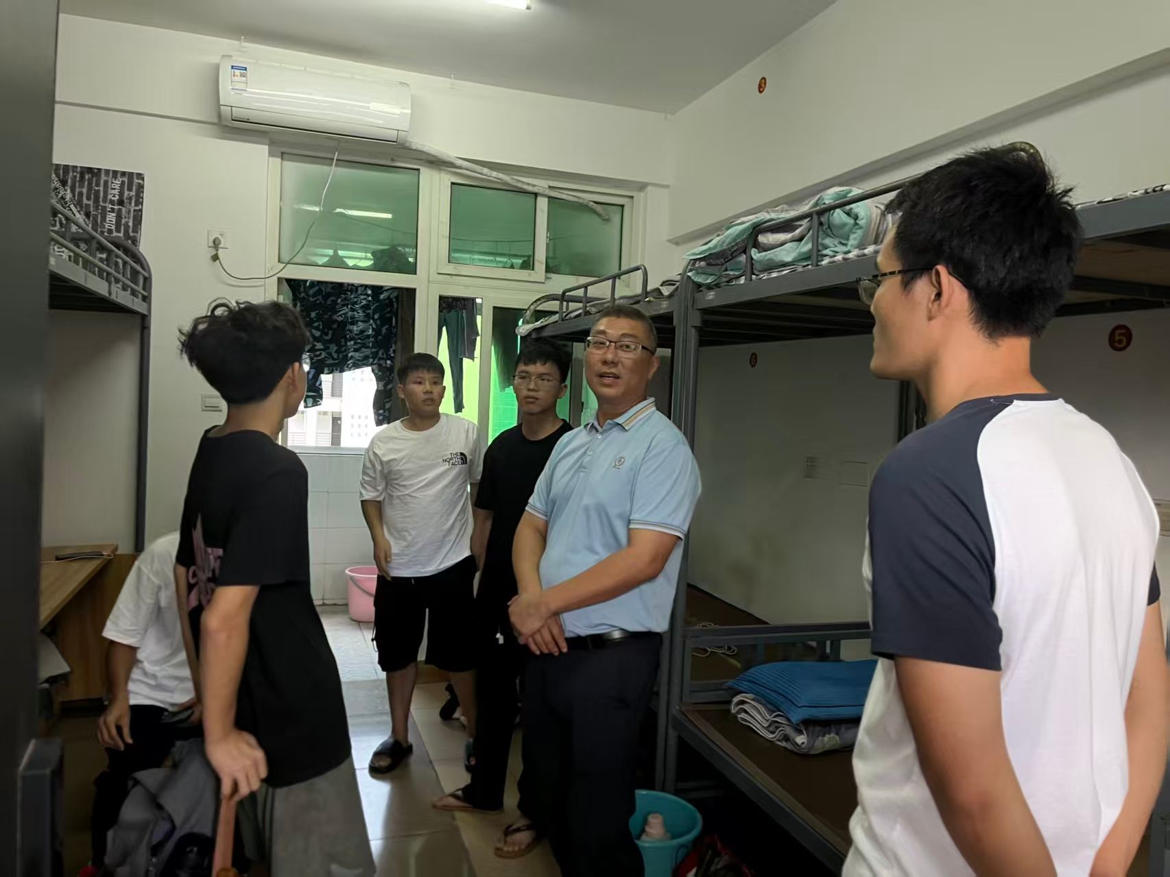 走访期间,老师们仔细检查宿舍水电、门窗等设施,对新生反映的淋浴喷头出水不畅、门锁损坏等问题逐一登记,并承诺将第一时间协调维修人员处理。代班学长学姐也主动分享校园生活经验,细致叮嘱日常注意要点,同时告知新生:遇到问题可随时联系自己或辅导员。