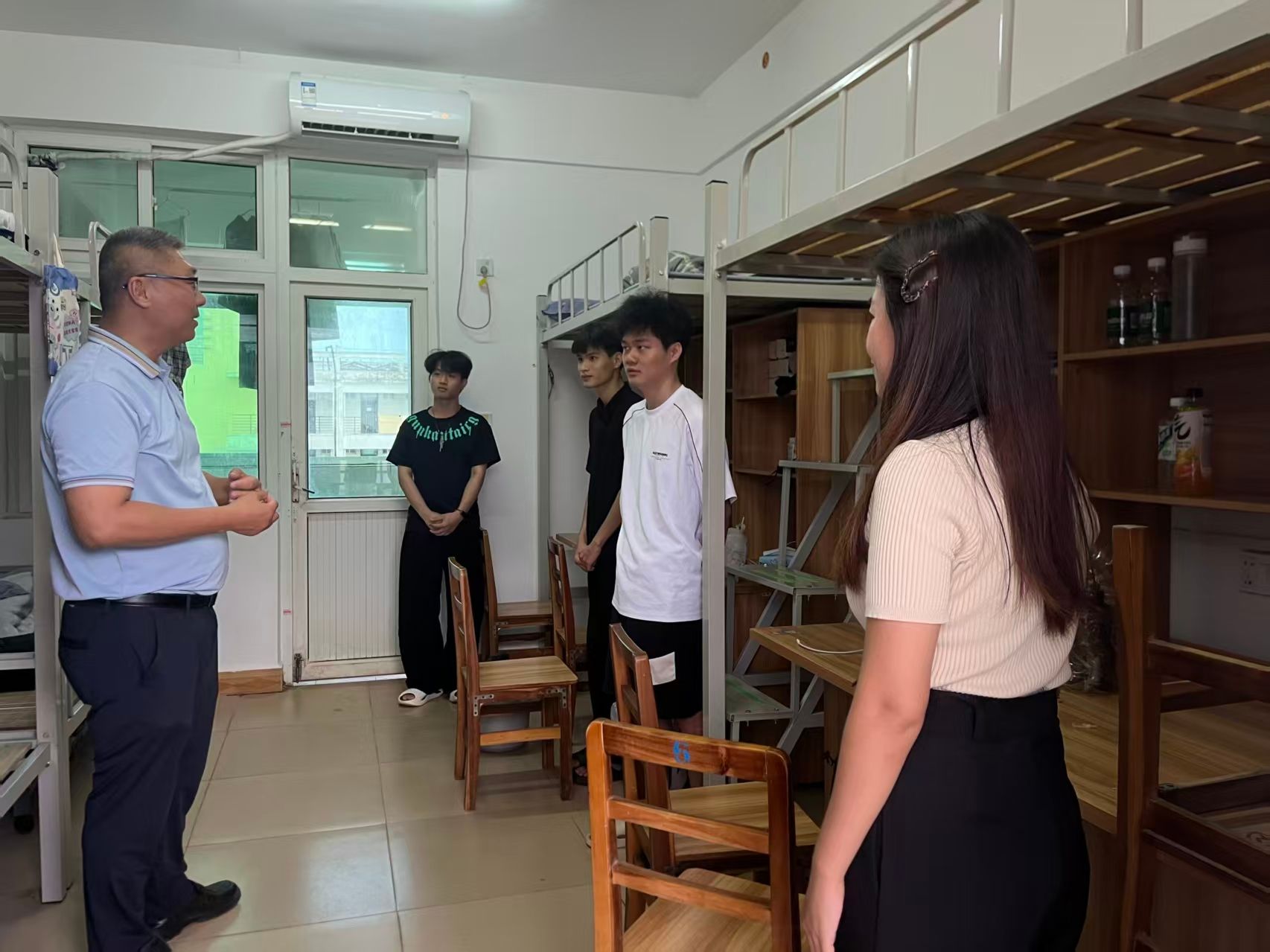 走访队伍逐间走进新生寝室,黄守官副书记、王智娴老师细致询问同学们的住宿情况,耐心解答学业、生活等方面的疑问。“宿舍生活还习惯吗?”“有没有需要公司协助解决的困难?”一句句关切的问候,迅速拉近了师生距离。黄守官副书记着重强调安全意识的重要性,提醒同学们警惕网络诈骗,妥善保护个人信息,严防信息泄露;王智娴老师则叮嘱新生外出尽量结伴而行,并严格遵守返校时间。