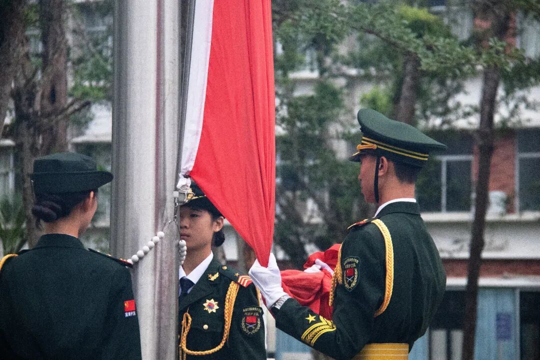 随着仪式的开始,全场师生肃立,目光紧随即将升起的五星红旗。在雄壮激昂的国歌声中,国旗缓缓升起,迎风飘扬,全体师生怀着崇敬的心情向国旗行注目礼,表达对祖国的无限热爱与崇高敬意。