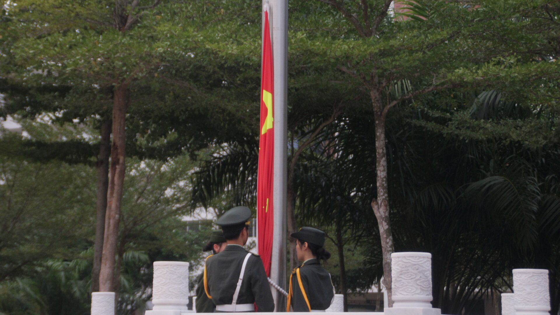 第一项,升国旗奏国歌。国旗护卫队队员们迈着铿锵有力的步伐护送五星红旗缓缓走来,当庄严的国歌奏响时,国旗护卫队旗手将五星红旗冉冉升起,迎风飘扬,全体师生向国旗行注目礼。