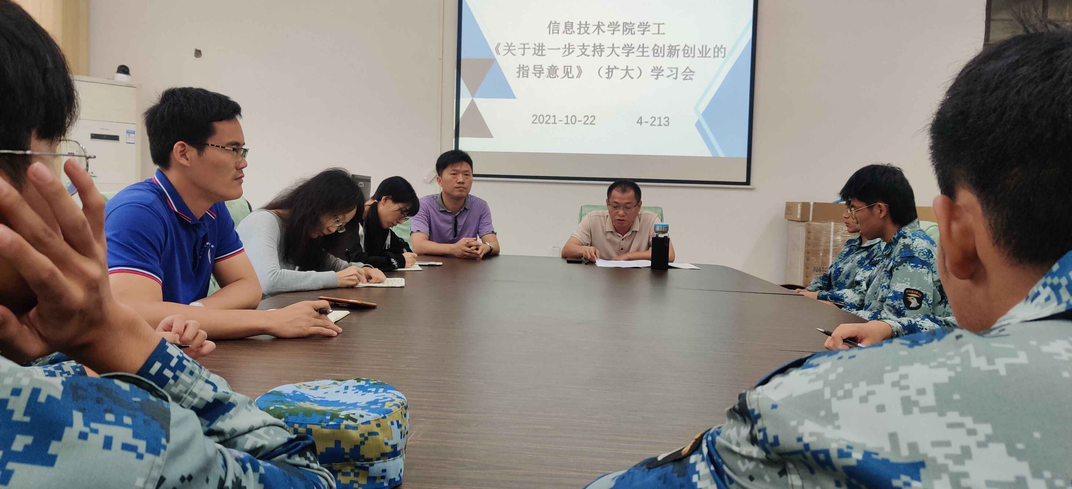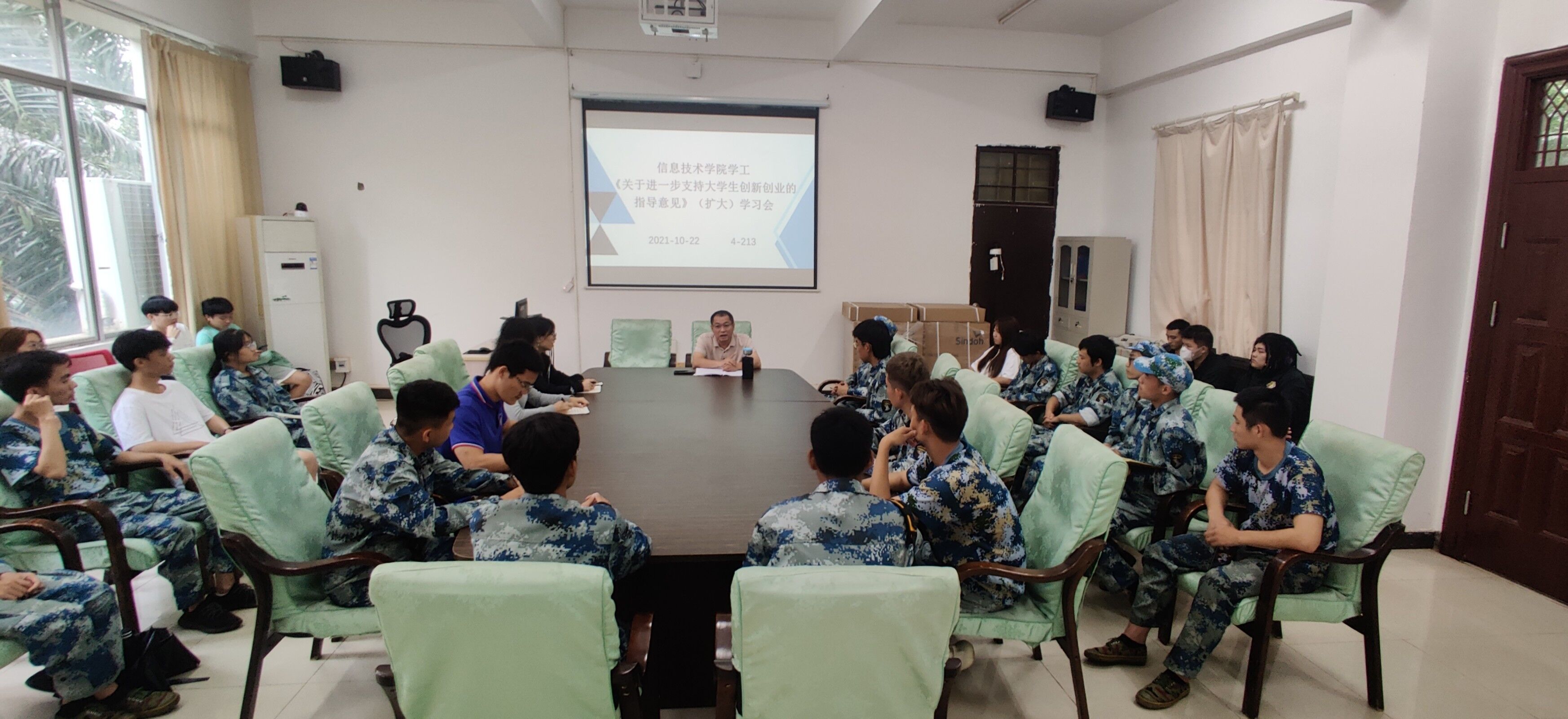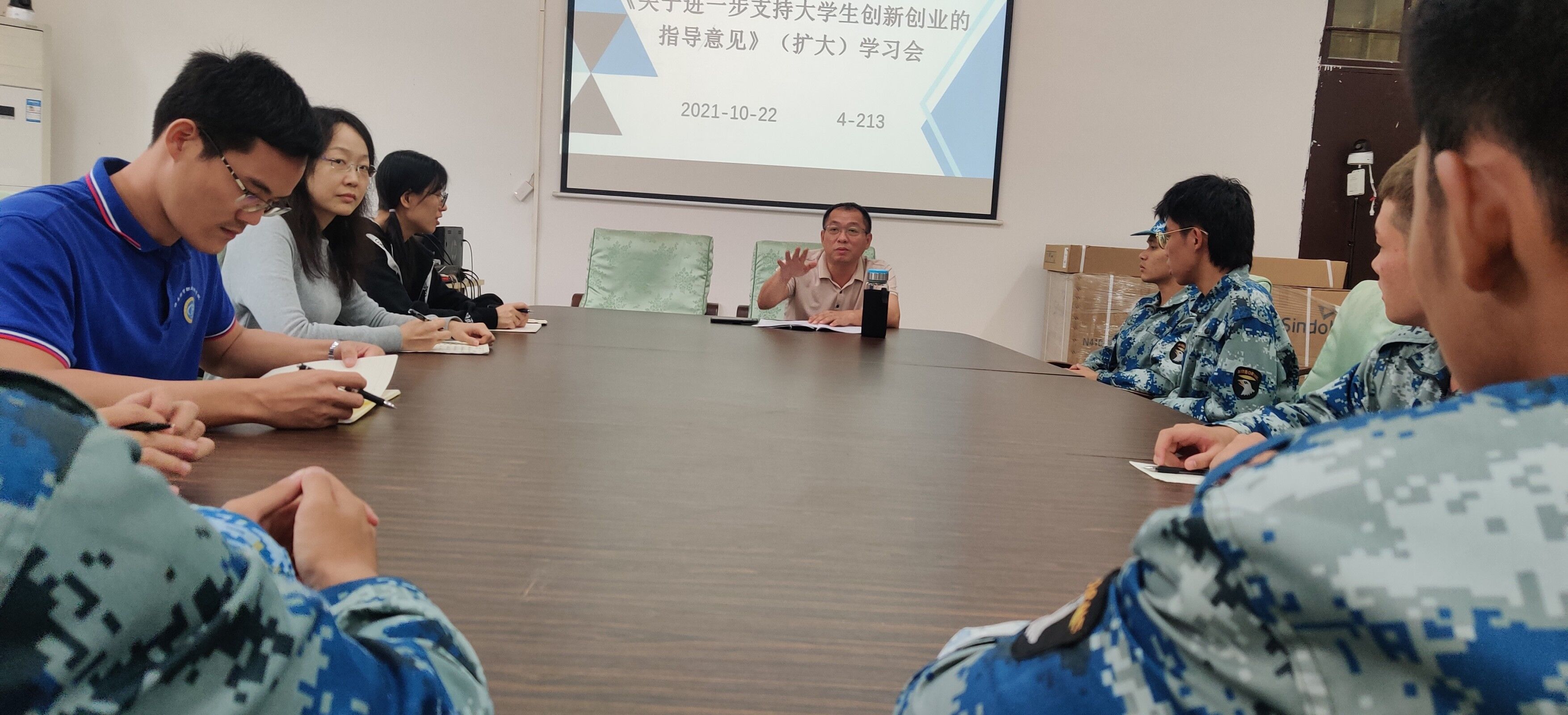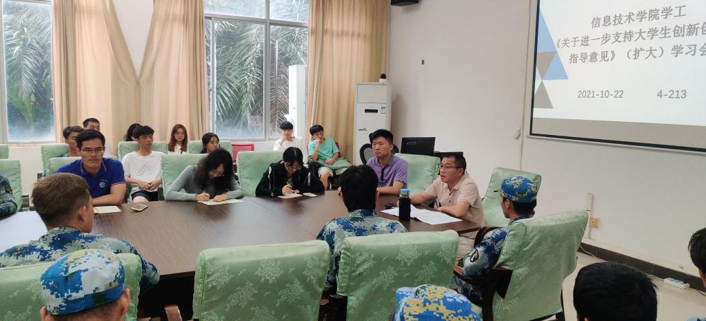 2021年10月22日中午,beat365英国官网网站在会议室4-213召开了《关于进一步支持老员工创新创业的指导意见》(扩大)学习会,本次会议由孙金书记主持,beat365英国官网网站全体辅导员、2020级和2021级全体班长到场参加。