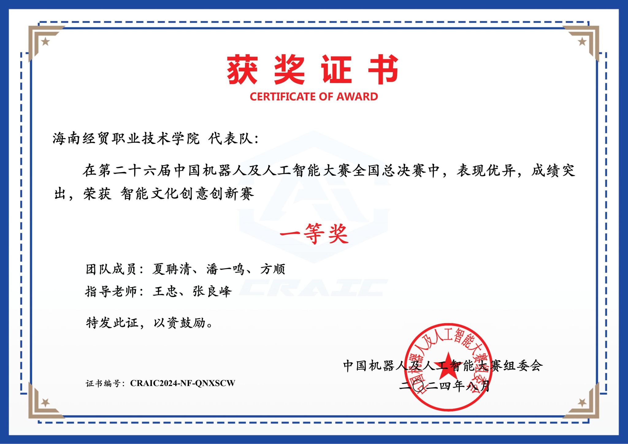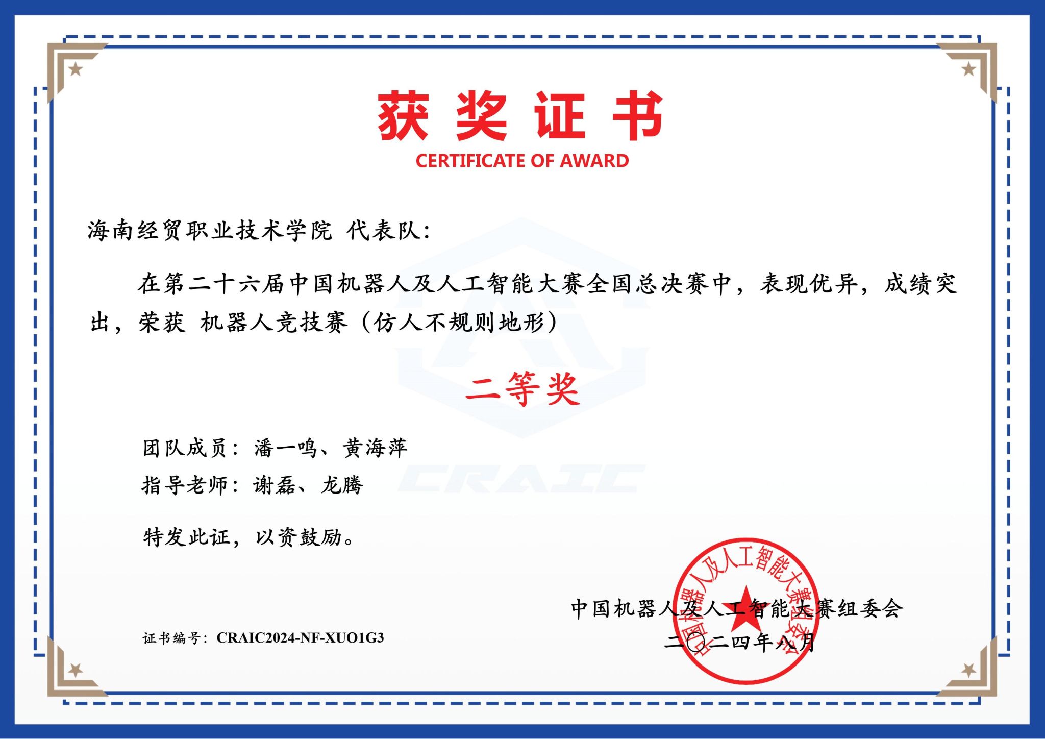 8月25日,第二十六届中国机器人及人工智能大赛全国总决赛顺利结束。beat365英国官网网站夏聃清、潘一鸣、方顺同学荣获“智能文化创意创新赛国赛一等奖”(指导教师:王忠、张良峰),潘一鸣、黄海萍同学荣获“机器人竞技赛国赛二等奖”(指导教师:谢磊,龙腾)。