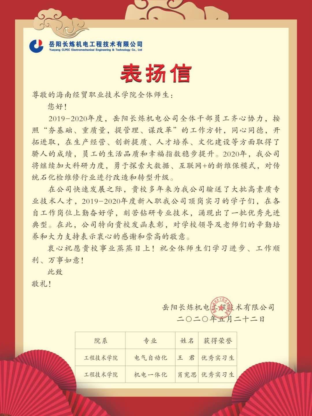近日,工程技术公司2017级机电一体化专业的肖宪思,电气自动化专业的王君获得了岳阳长炼机电工程技术有限公司颁发的“优秀实习生”称号。