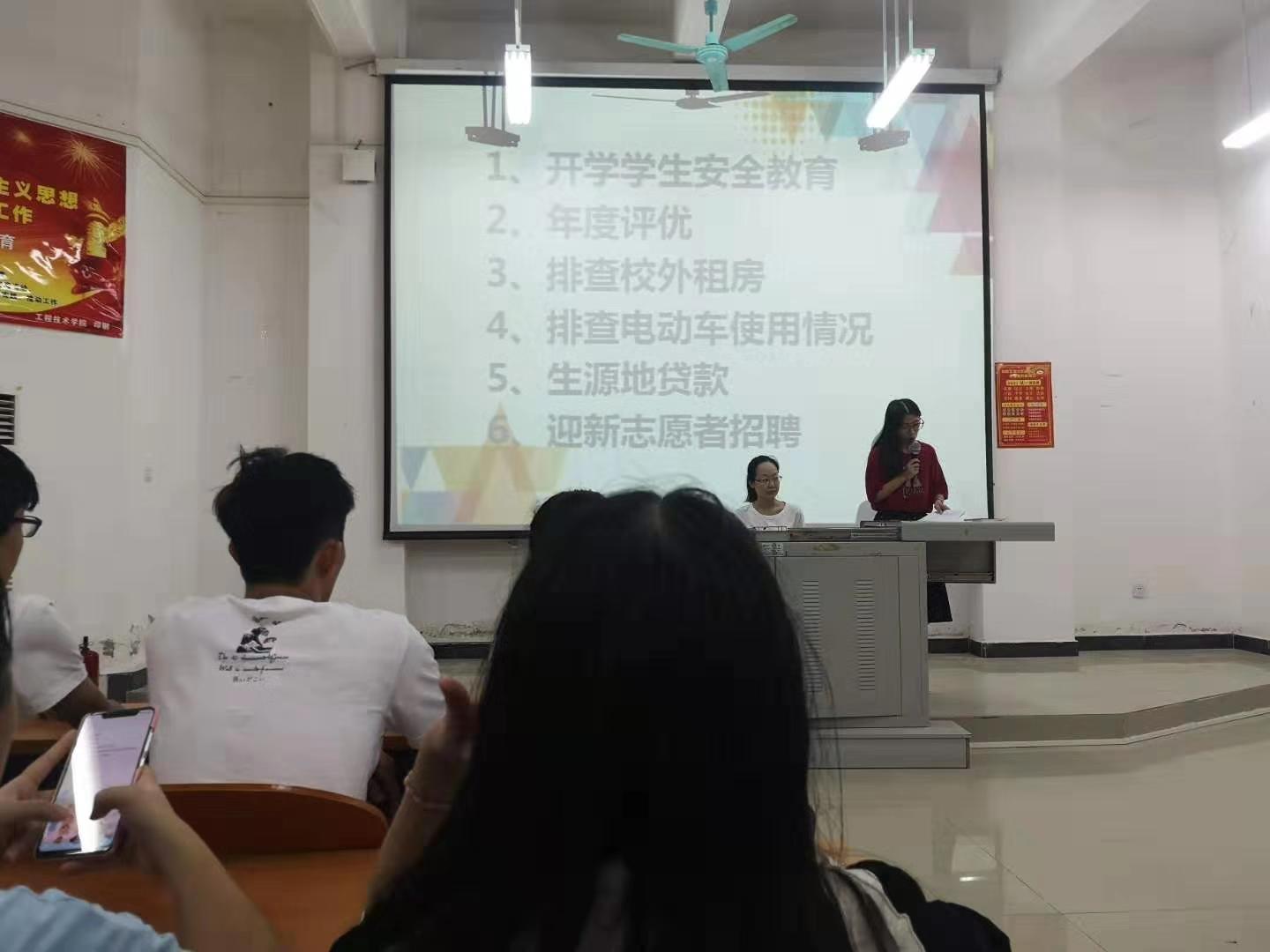 本次会议主要围绕:“开学员工安全教育、年度评优、排查校外租房、排查电动车使用情况、生源地贷款、迎新志愿者招聘”等事件展开。