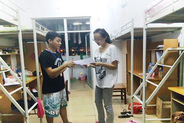 代老师先后对10栋(男生宿舍)、7栋(男生宿舍)、11栋(女生宿舍)进行了检查慰问,通过和同学们的亲切交流,了解到大家的暑期生活状况,并要求同学们尽快调整自己的心态,融入到新学期的学习环境和生活环境中。同时,代老师也在宿舍安全、宿舍卫生、宿舍文化等方面进行了检查指导,嘱咐同学们要注意宿舍的财务安全和用电安全,提高安全防患意识。代老师对宿舍总体情况较为满意,同时也为需要调改的宿舍进行了指导说明,代老师希望大家能维持整洁的室内环境、丰富宿舍文化,希望学子们继续保持健康向上的精神面貌。