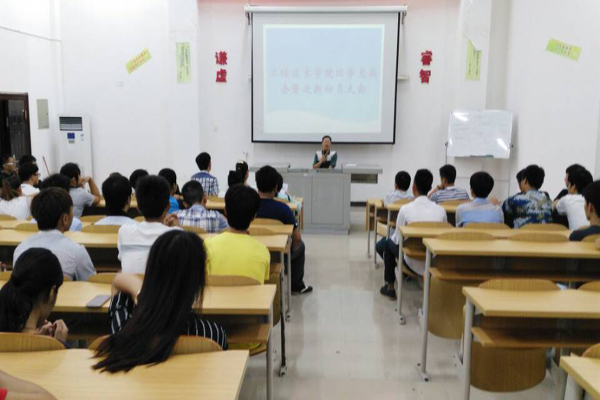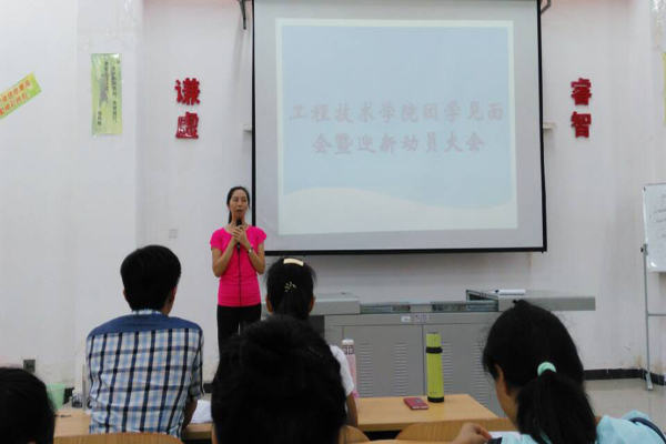 晚上19:30,主席宣布工程技术公司团学见面会暨迎新动员大会正式开始。首先,由原机电系导员陈秋菊老师为两系团学相互配合工作进行引导讲话。由于公司的要求,原两个系部合成了现在的工程技术公司,为了使这个大家庭有条不紊的运作下去,陈秋菊老师希望大家能做好带头作用,两系之间相互磨合,相互交流,共同创造公司新篇章。