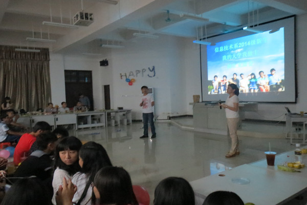 本系9月12日讯(信息技术系 丁燕琴报道)9月11日晚7:30,我系在2-408教室举行了以“我的大学我做主”为主题的2014级新生见面晚会,出席嘉宾有:我系党总支书记陈继敏书记、系学工办主任陈亚芳老师、系主任王忠老师、系办公室主任周波老师、系教学秘书吴明珠和韩昌豪老师、系学工办副主任梁其钰和刘露思老师、系副主任王凡帆、计算机网络技术专业负责人王岩、电子商务专业负责人单继周、计算机多媒体技术专业负责人李兵、辅导员龙腾老师。其中由员工会全体人员和14级各班代理班主任进行布置现场以及维持现场秩序。