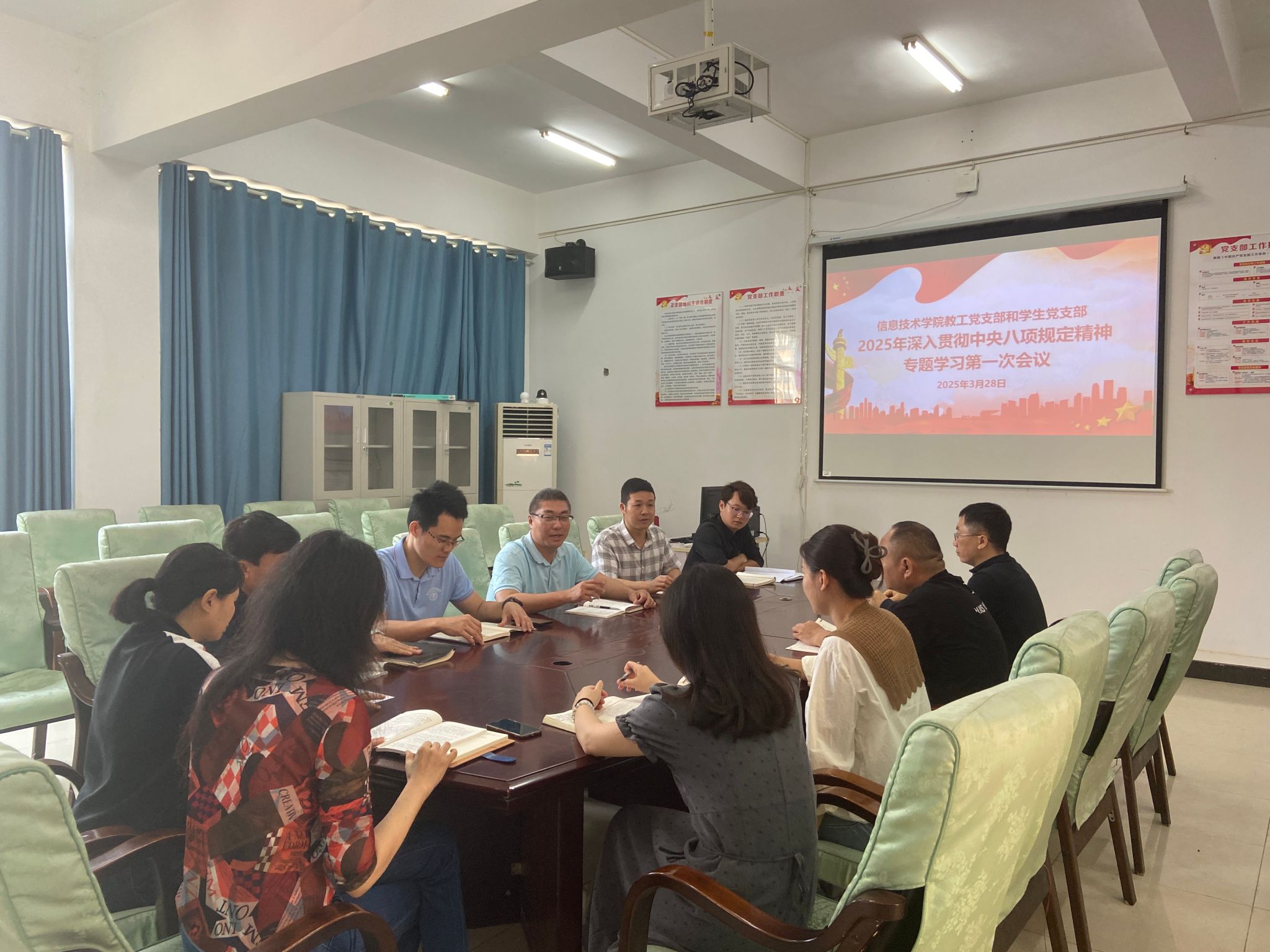 2025年3月28日上午,公司教工党支部和员工党支部在4-213联合召开2025年度深入贯彻中央八项规定精神专题学习第一次会议,会议由教工党支部书记康东主持。