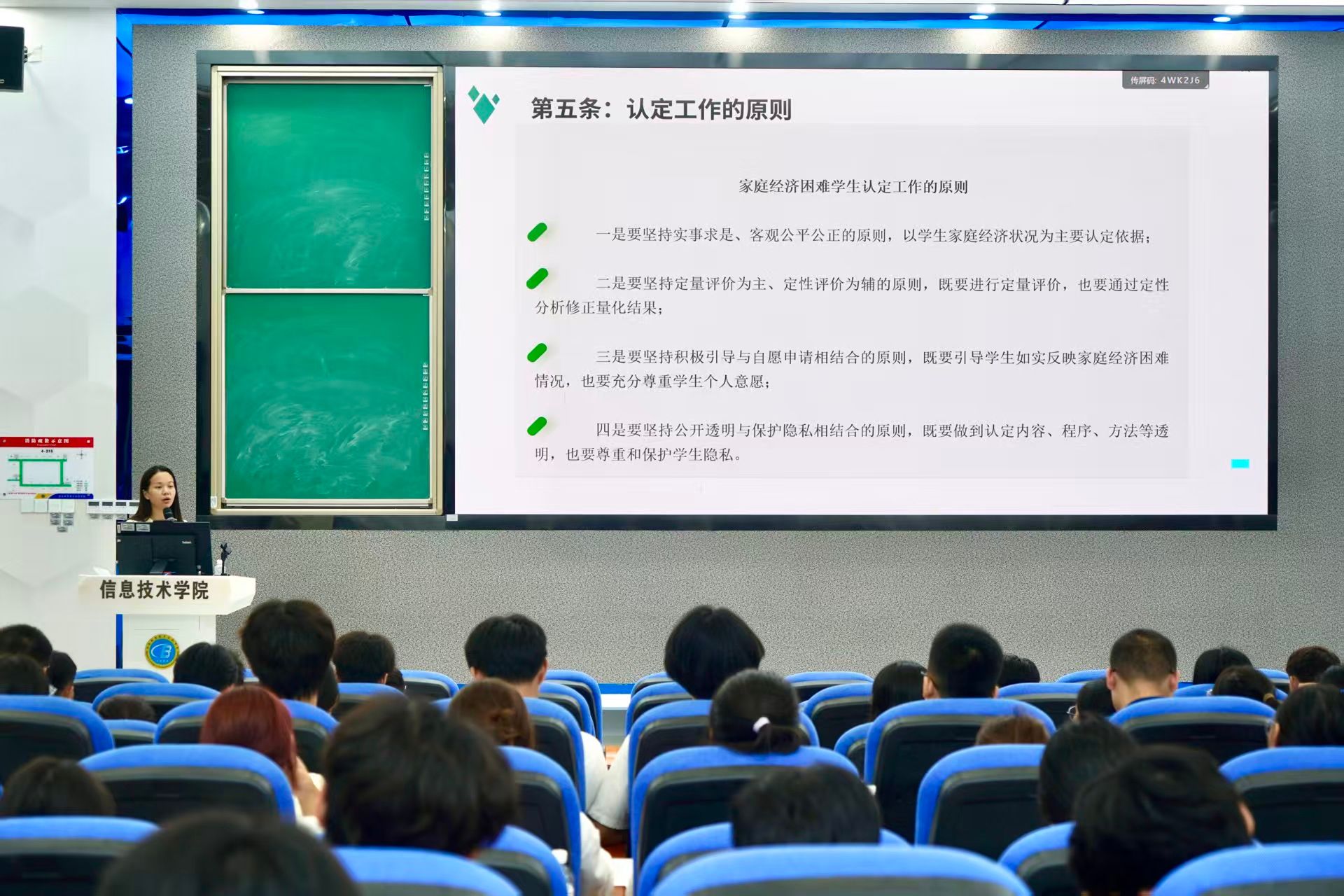 针对新生可能存在的政策疑惑,王智娴老师特别指出,认定工作坚持“实事求是、公平公正”原则,只需如实填报申请表并附上相关佐证材料。她还介绍了公司奖助学金、助学贷款等资助项目的申请节点与材料要求,鼓励符合条件的新生主动申请,并强调诚信申报的重要性,提醒新生若家庭经济状况发生变化需及时与公司沟通。