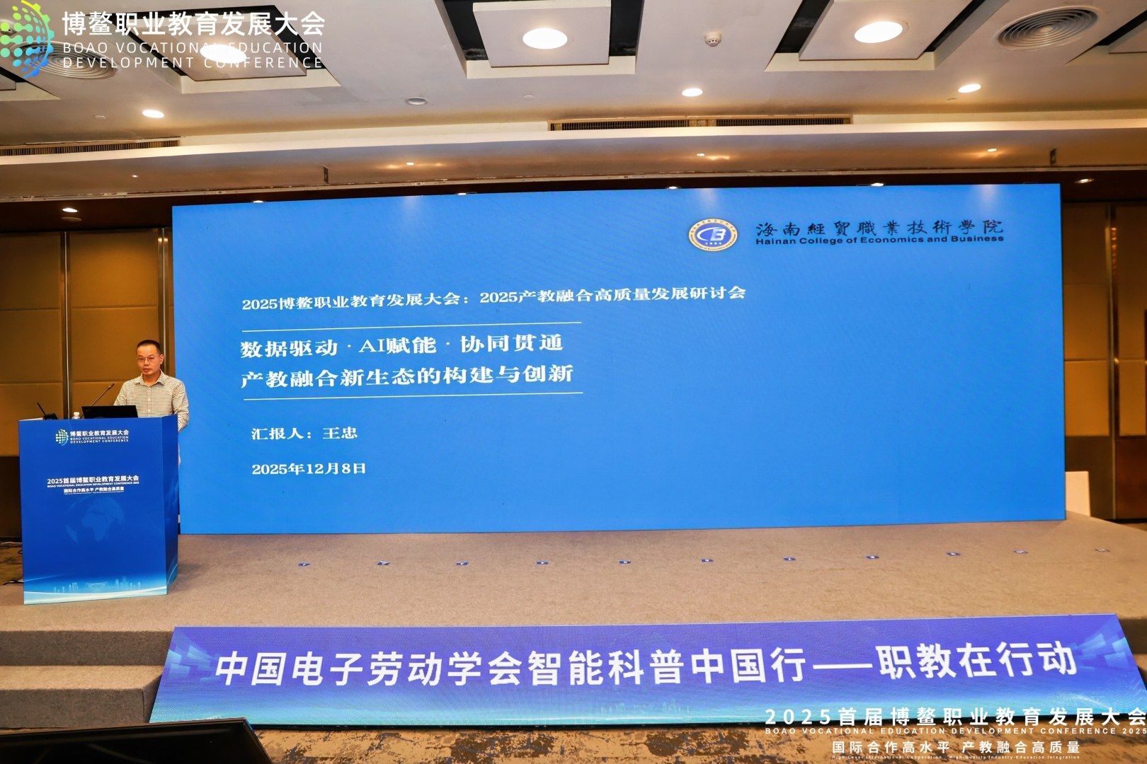 2025年12月5-8日,由博鳌职业教育发展大会组委会主办的“2025首届博鳌职业教育发展大会”在海南博鳌亚洲论坛国际会议中心隆重举行。在“中国电子劳动学会科普工作委员会2025年会暨智能科普中国行—职教在行动(海南站)”分论坛上,王忠经理受邀作主题报告,分享了公司在产教融合领域的创新探索与实践成果,引发与会专家学者的广泛关注。